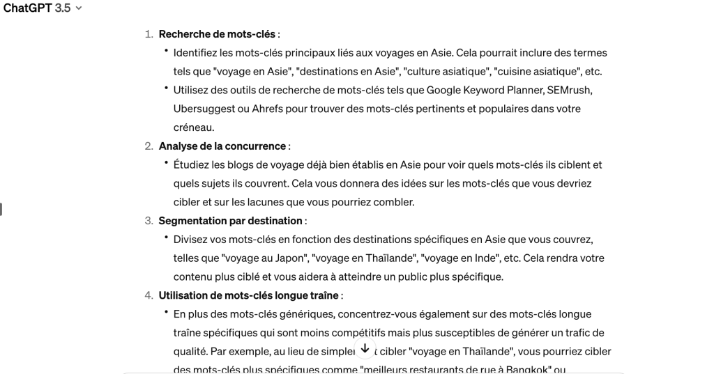 Voici un exemple de la réponse de ChatGPT lorsqu’on pose la question de créer une stratégie SEO pour un blog de voyage en Asie.