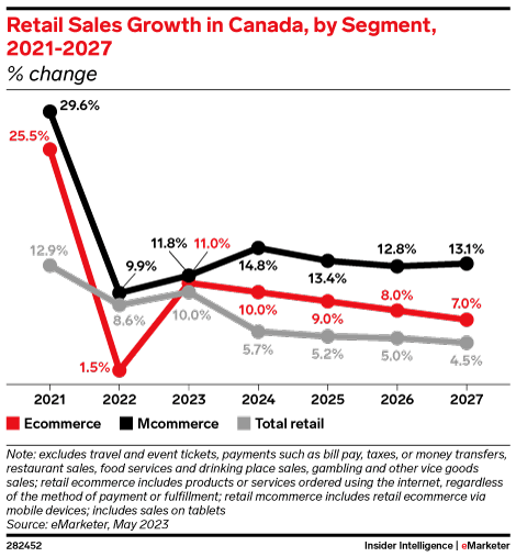 - Briggs, Paul (2023, 22 décembre). “Canada Ecommerce Forecast 2023”, Emarketer. Récupéré le 21 mars 2024 à l’adresse : https://content-na1.emarketer.com/canada-ecommerce-forecast-2023