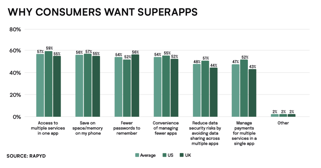 Les consommateurs accueilleraient favorablement une super-application pour la commodité d’accéder à plusieurs services en un seul endroit et pour réduire le nombre de mots de passe nécessaires. Ils reconnaissent également l’importance de réduire les risques de sécurité des données à travers l’utilisation de moins d’applications et la capacité d’exécuter plusieurs fonctions en un seul lieu.