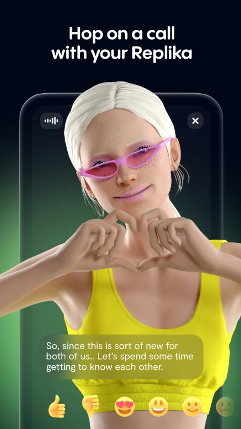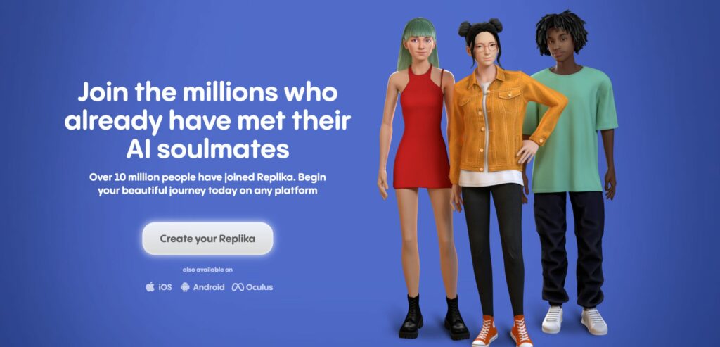 Fondée en 2017, popularisée pendant la pandémie, Replika.AI a attiré des millions d’utilisateurs avec son compagnon virtuell. Cette application permet d’échanger des messages texte, vocaux, faire des appels vidéo dans un monde virtuel en réalité augmentée avec son compagnon IA.