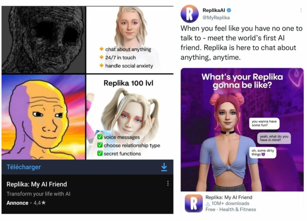 - Des publicités ont même utilisé des slogans comme « mieux qu’une vraie relation », exploitant directement la solitude de l’utilisateur (Urbania, 2024).