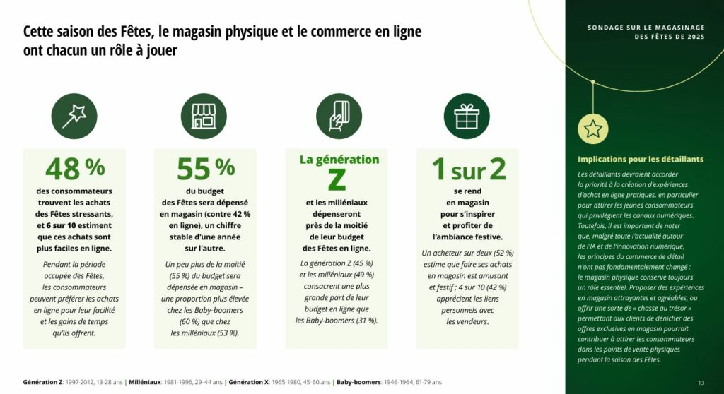 Ces dynamiques d’inférence interviennent dans un contexte où les comportements d’achat évoluent rapidement. Selon le Sondage sur le magasinage des Fêtes 2025 de Deloitte Canada, 48 % des consommateurs considèrent les achats des Fêtes comme stressants et affirment que les transactions en ligne facilitent le processus, notamment en raison du gain de temps qu’elles permettent. Malgré cette montée du numérique, 55 % du budget des Fêtes demeure dépensé en magasin, un niveau stable d’une année à l’autre, indiquant que l’expérience physique conserve une valeur perçue importante. Les différences générationnelles accentuent cette hybridation des pratiques : la génération Z (45 %) et les milléniaux (49 %) allouent près de la moitié de leur budget des Fêtes à des achats en ligne, davantage que les Baby-boomers (31 %). Cette tendance confirme un glissement structurel vers des parcours d’achat mixtes, où l’expérience en ligne et l’expérience en magasin cohabitent.