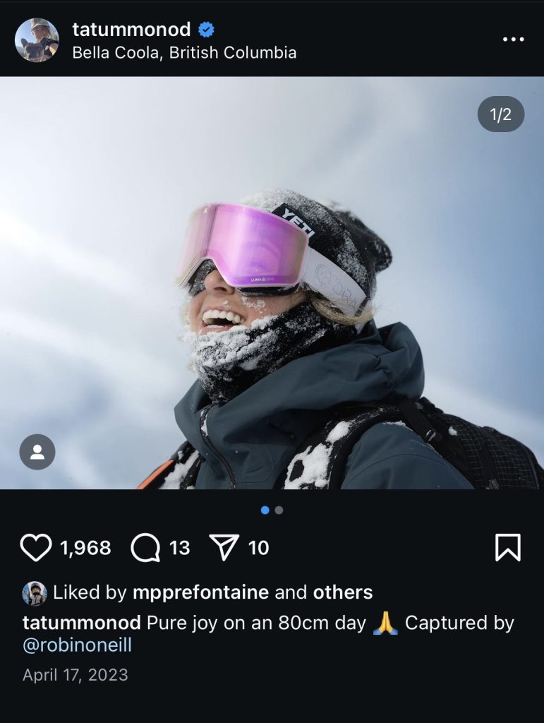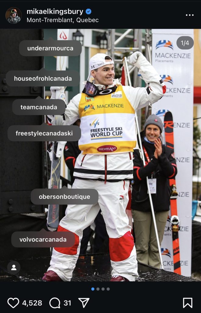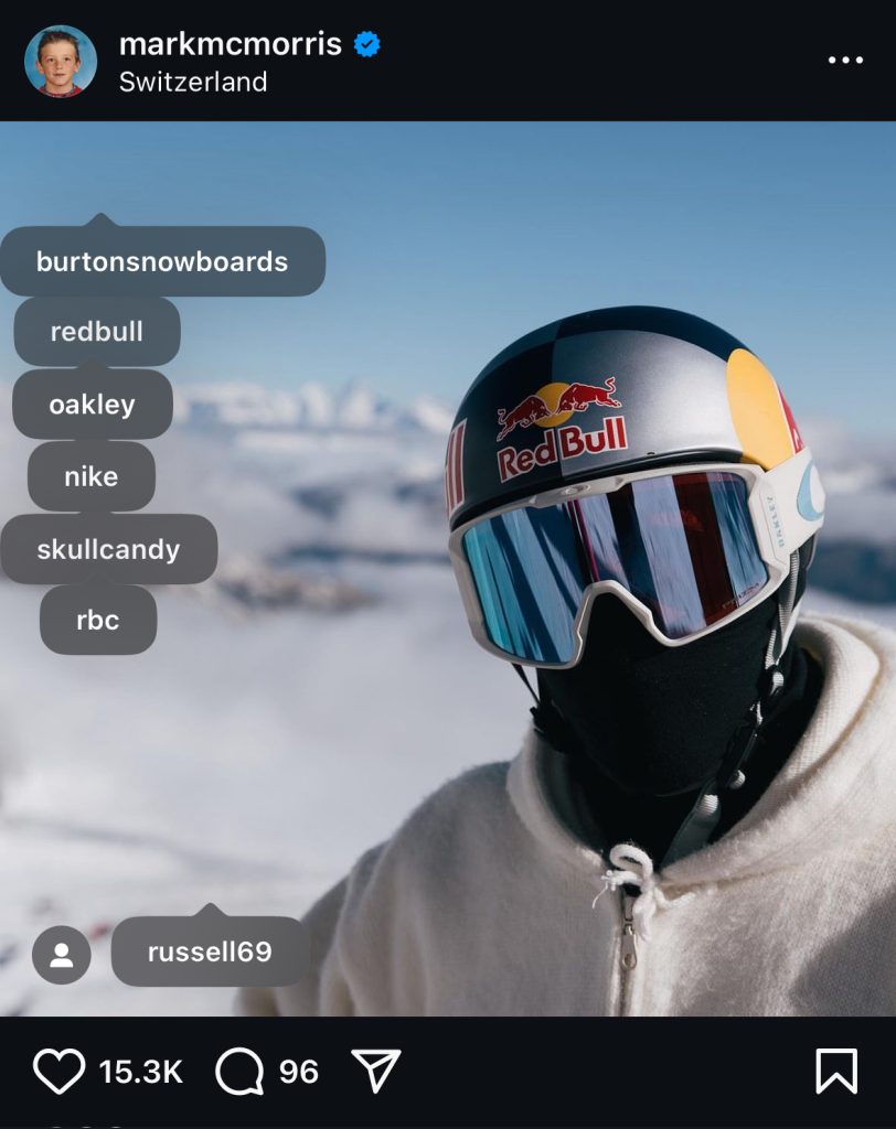 Certains athlètes vont même au-delà de porter le logo sur la base quotidienne. Ils utilisent même leur contenu Instagram pour continuer à promouvoir leur affiliation avec certaines marques. Comme par exemple, la publication Instagram ci-dessous de l’athlète snowboarder Mark McMorris démontre clairement toutes les marques présentes sur sa publication qui lui offrent support dans sa carrière d’athlète. C’est une des approches plus naturelles que la grande majorité des athlètes empruntent pour représenter les marques qui les supportent au quotidien.
