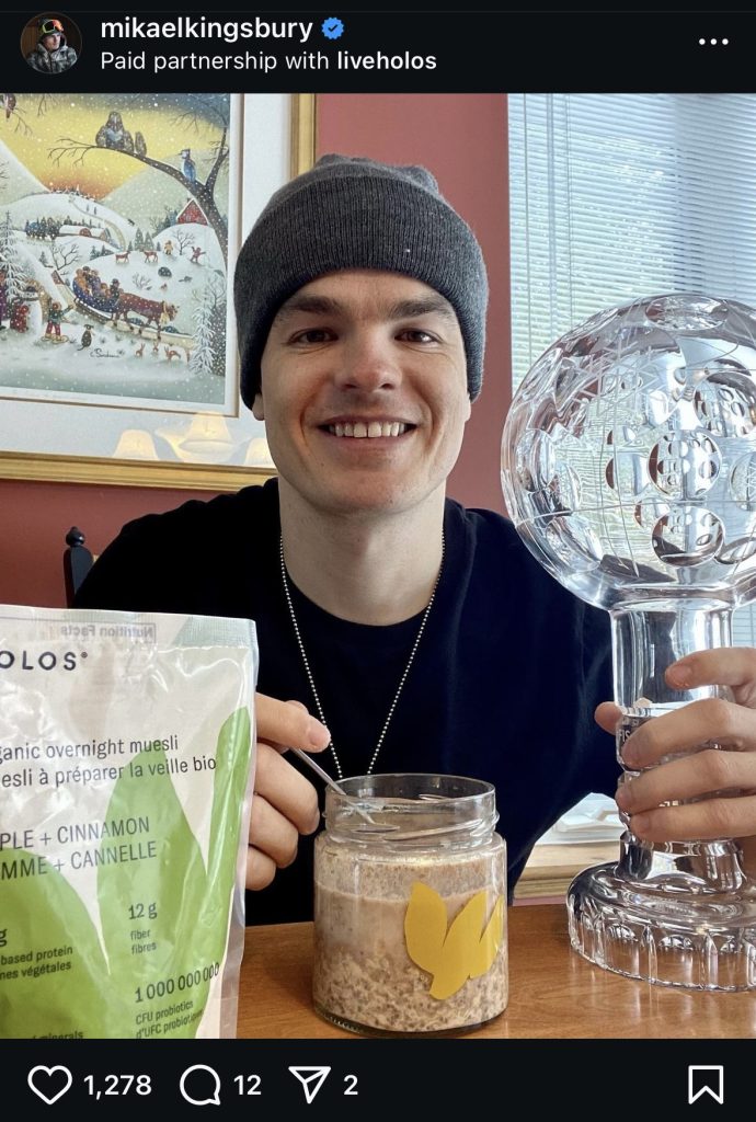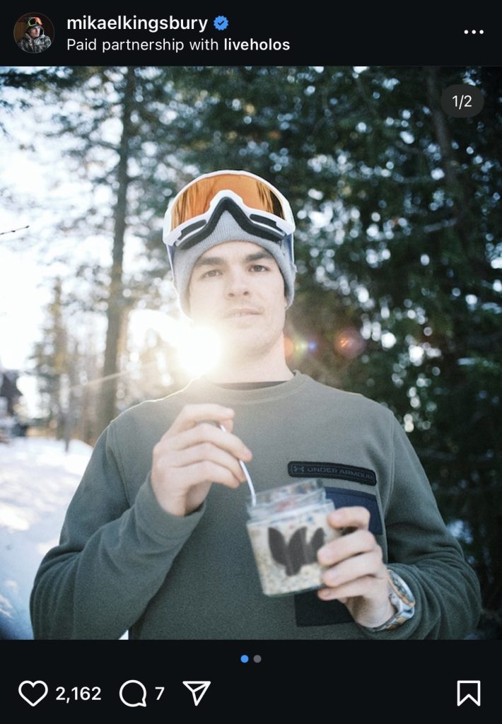 Une autre facette du marketing d’influence sur Instagram par ces athlètes est celle de collaboration avec les marques pour créer du contenu publicitaire avec celles-ci. Comme démontré ci-dessous, Mikael Kingsbury utilise sa page Instagram pour faire également du contenu publicitaire avec la compagnie Live Holos. Cette compagnie le supporte en tant qu’athlète tout en n’étant pas une compagnie qui contribue physiquement à son sport, comme par exemple une paire de ski. Par contre, il promeut un mode de vie sain qui l’aide, en tant qu’athlète, à mieux performer grâce à son alimentation, grâce à Live Holos.