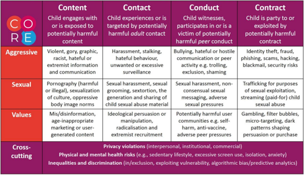 Livingstone, Sonia, et Mariya Stoilova (2021). The 4Cs: Classifying Online Risk to Children, (CO:RE Short Report Series on Key Topics), Hamburg: Leibniz-Institut für Medienforschung | Hans-Bredow-Institut (HBI), CO:RE – Children Online: Research and Evidence. Récupéré de https://doi.org/10.21241/ssoar.71817.