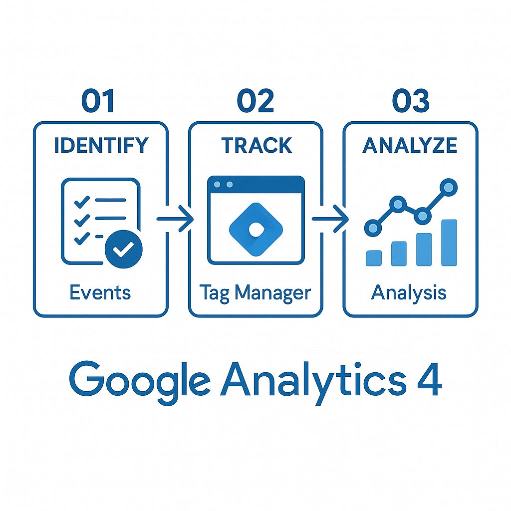 Vient ensuite l’implémentation technique via Google Tag Manager et Google Analytics 4. Le modèle événementiel de GA4 permet de créer et suivre des custom events (clics, téléchargements, scrolls) pouvant être marqués comme key events pour l’analyse.