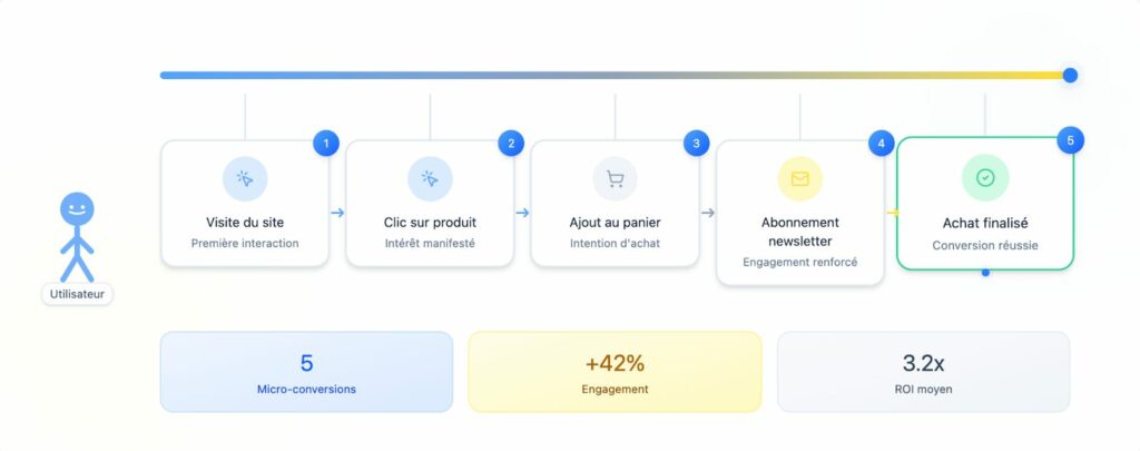 Les micro-conversions désignent ces petites actions qui traduisent un intérêt avant la conversion finale. Selon Hotjar (2022), elles représentent une petite action qui traduit l’intérêt ou l’intention d’un utilisateur avant la conversion finale. À l’inverse, la macro-conversion correspond à l’objectif principal : achat, inscription ou réservation.