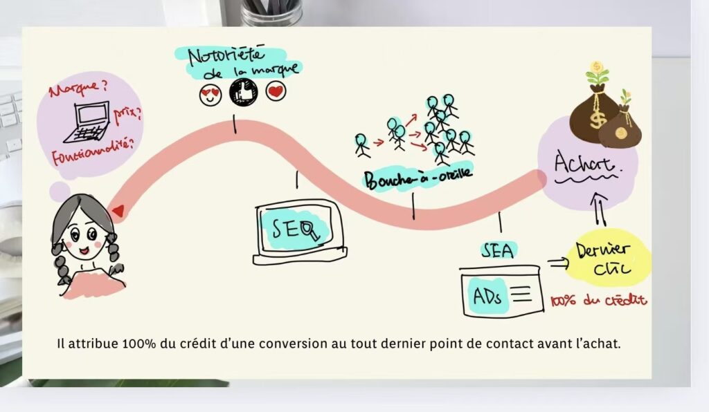 Par défaut, les outils tels que Google Analytics fonctionnent selon un modèle d’attribution au dernier clic, comme l’ont souligné les études de JoAnn Sciarrino et al. (2019), le modèle d’attribution attribue le crédit de la conversion à la dernière interaction et au dernier clic, tel que le SEA, sans tenir compte des effets à long terme ou à moyen terme (par exemple, SEO ou le contenu de marque). Gabriel Tassé pense aussi que ce modèle surestime massivement le rôle des campagnes payantes en ignorant l’ensemble du parcours client qui a précédé : le bouche-à-oreille, la notoriété de la marque, les articles de presse, ou encore le contenu organique. Cette vision partielle a directement poussé les entreprises à réduire les budgets alloués à l’amélioration de la notoriété et de l’image de marque, réduisant ainsi les investissements essentiels à l’avenir de la marque.