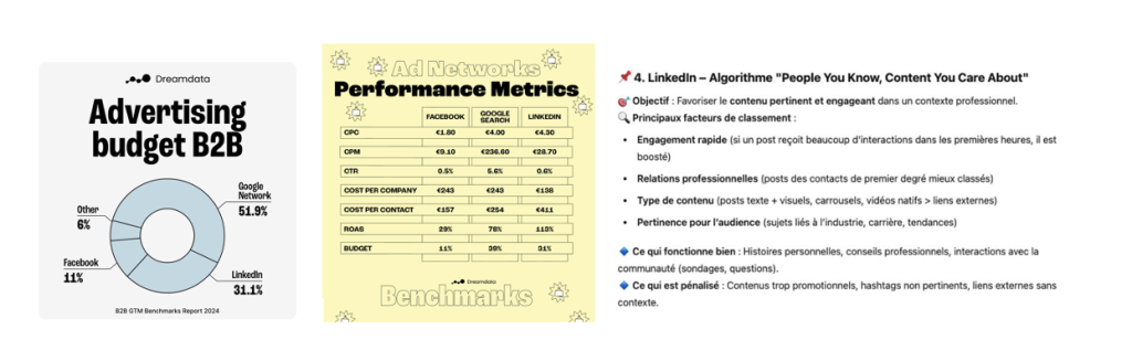 - L’<h2>approche payante<h2> permet d’accélérer la visibilité et de cibler les bonnes personnes et d’augmente le contenu clé (posts stratégiques) et génère des leads. Quelques exemples possibles :