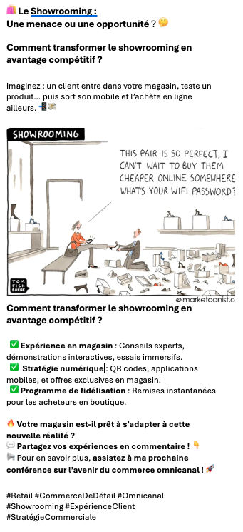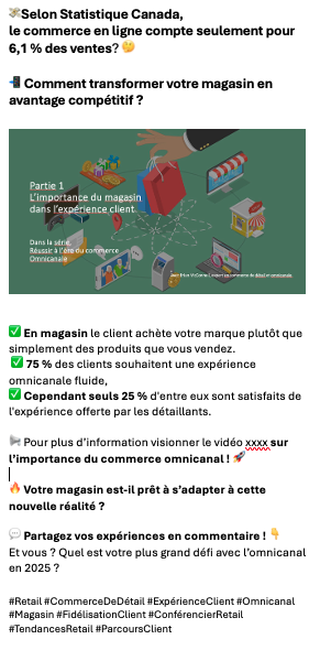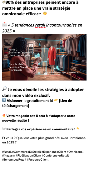- Quelques hashtags trouvés à inclure : #Retail #CommerceDeDétail #ExpérienceClient #Omnicanal #TendancesRetail #Ecommerce #FidélisationClient #ConférencierRetail