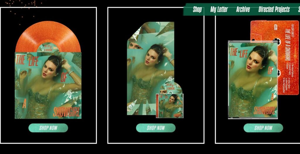 If you want people to buy your new album, you need to make it as easy as possible for people to buy it. When Taylor Swift wanted people to presave or pre-purchase her album, she added smart links to do so everywhere. Whether it was on the landing page of her website or her instagram bio, the user just had to make one click and was already on the purchase page making the experience very simple. Both laptop and phone screens have stunning and intriguing designs adapted to the screen size, and “shop now” buttons that enhance user experience.